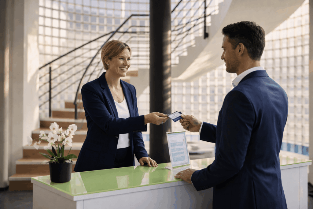 Direkt im Eingangsbereich steht ein Empfangspult zur Verfügung, an dem Gäste, Teilnehmende oder Kunden professionell begrüßt werden können. Ideal für Check-in, Registrierung, Ticketkontrolle oder persönliche Betreuung zu Beginn der Veranstaltung.
